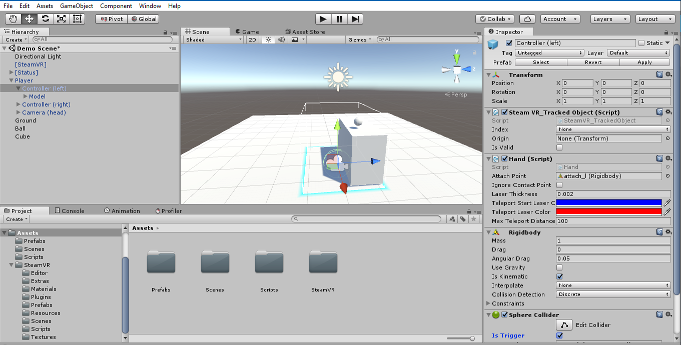 Now that the hand script is complete, we need to attach it to our hands in our demo scene. To do this, expand the CameraRig object in the Hierarchy window, and select one of the hands. Drag the Hand script to the inspector window, adding it as a component. From there, you need to setup an attach point, which should be a rigid body under the controller model in the hierarchy. Also add a sphere collider to the controller, enabling the “Is Trigger” checkbox. This will allow our OnTriggerEnter and Exit methods to work properly with the controllers. This should look similar to this: